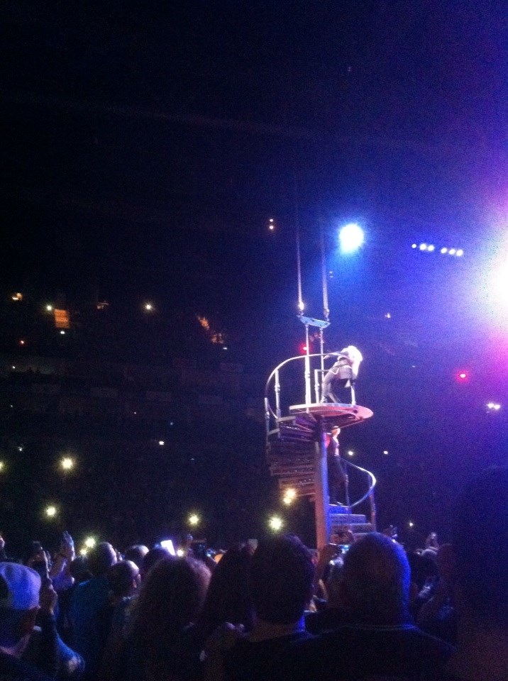 To those who said she wouldn’t play True Blue until she was over Sean Penn, she waves a eukelele as she tackles it acoustic style and the appreciative O2 crowd joins in acapella in a fashion that is quite moving. We’re also treated to an unexpected Like A Prayer to mark World AIDS Day.