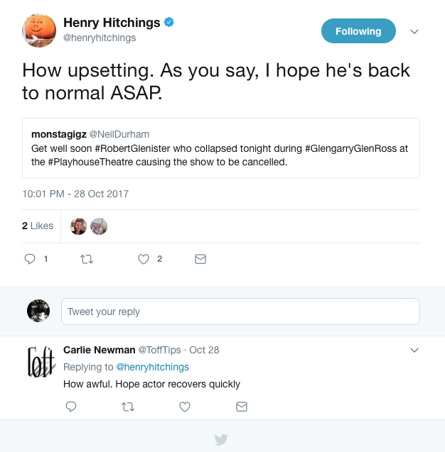 Get well soon from all at monstagigz to Robert Glenister. We’ve seen many things in our years of theatregoing but nothing quite so concerning on a London stage.