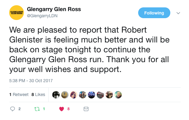 The play itself is about the pressure put on salesmen in 80s America as they compete to see who will keep their jobs. We’ll definitely be returning later in the run and wish Glenister and his family all the best.