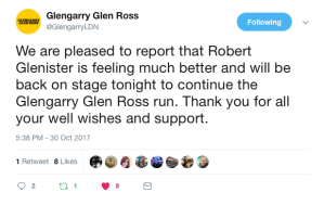 The curtain goes up, the stage is cleared and the venue’s deputy manager explains that Glenister is up and about (to a spontaneous round of audience applause) but that tonight’s show is cancelled.