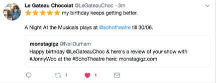 Today is Le Gateau Chocolat’s birthday which is fitting perhaps because his drag queen show with Jonny Woo is the most fun celebration of musicals running in London at the moment.