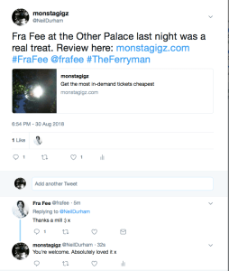 Most touching was the encore with his sister Nan Fee and their rousing version of Kate Bush and Peter Gabriel’s touching Don’t Give Up not least because their parents were also in the audience.