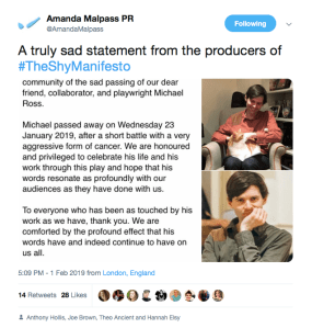 Or that the author of The Shy Manifesto, Michael Ross, would die (see below) less than a fortnight before tonight’s performance. He was a British playwright who was a graduate of the Royal Court’s Young Writers Programme whose plays were performed at the Arcola, the Southwark Playhouse and Old Vic Tunnels amongst many others.