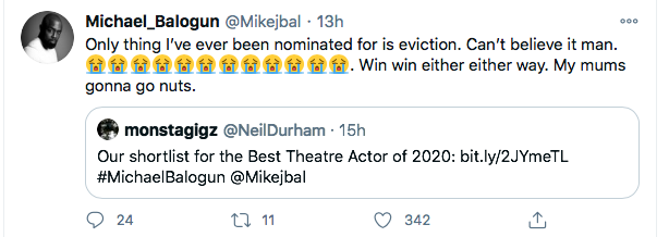 - Read on for the nominees for the monsta for Best Theatre Actor of 2020. 2019 winner: Daniel Monks 2018: Arinzé Kene , 2017: Andrew Scott, 2016: George Mackay, 2015: James McAvoy