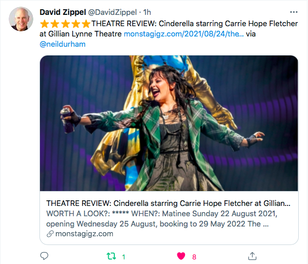 WHEN?: Matinee Sunday 22 August 2021, opening Wednesday 25 August, booking to 29 May 2022 UPDATE: We had the pleasure of catching understudy Georgina Onuorah’s Cinderella at the matinee on Sunday 29 August. Her Cinderella may not have Hope Fletcher’s star power yet but it was an individual, thrilling performance very much in keeping with the part. A 5* debut in a 5* show.