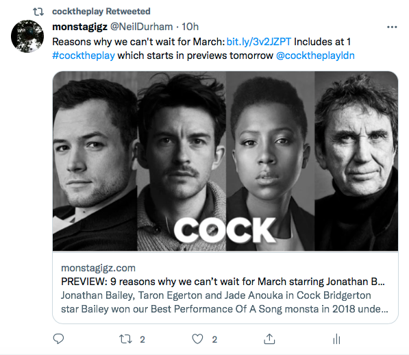 Bridgerton star Bailey won our Best Performance Of A Song monsta in 2018 under Marianne Elliott’s direction in Sondheim’s Company, currently running on Broadway. Elliott returns to direct here. Anouka won a monsta too in 2016 for Best Theatre Actress in the Shakespeare Trilogy. Both star with Egerton (Rocketman) and Phil Daniels (Les Miserables). Mike Bartlett’s 2009 (Snowflake) play about a gay male couple threatened from an unlikely source originally starred Ben Whishaw, Andrew Scott and Katherine Parkinson. Runs 5 March through 4 June 2022 at the Ambassadors Theatre. Tickets The view from the audience as Egerton fainted at the 1st preview