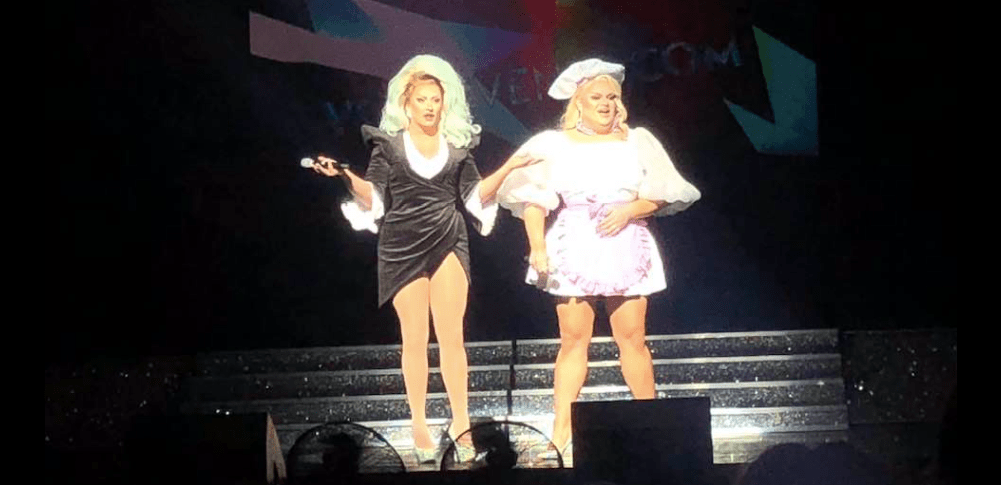 The best bit during this celebration of the 3rd series of BBC’s RuPaul’s Drag Race UK is when it is compered by runner-up queens Ella Vaday and Kitty Scott-Claus (see pictured below) who have real warmth and charisma.