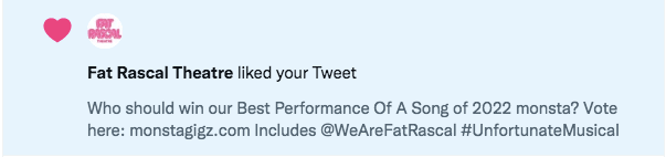 - Vote for Best Podcast of 2022; Best Venue; Best Performance Of A Song; Best New Musical; Best Gig; Best New Play; Best Album; Best Supporting Actor; Best TV/Fim Actress; Best TV/Film Actor; Best TV; Best Film; Best Song; Best Theatre Actress; Best Theatre Actor; and Best Revival
