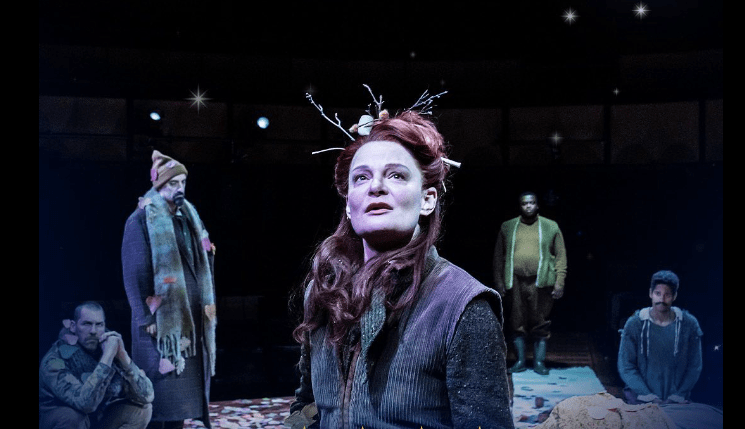 Jacques is played here by Martha Plimpton (pictured centre above), who we’ve never seen onstage before, and she’s an absolute revelation here with her deep voice providing gravitas to her character and even bursting into song occasionally making this a terrifically musical As You Like It.
