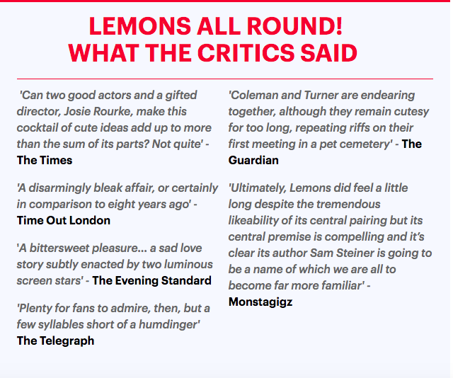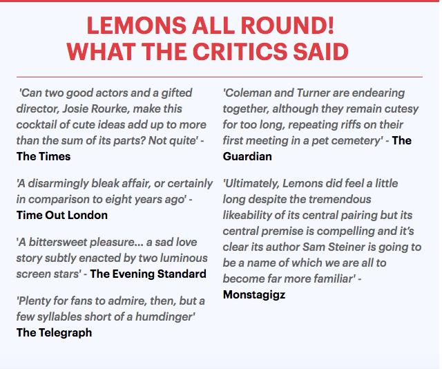 Lemons, Lemons, Lemons, Lemons, Lemons, to give the play its full title, had 3 sold-out runs at the 2015 Edinburgh Fringe Festival at the Walrus Theatre and its author – Sam Steiner – is working on multiple films currently with stars including Benedict Cumberbatch and Jessie Buckley.