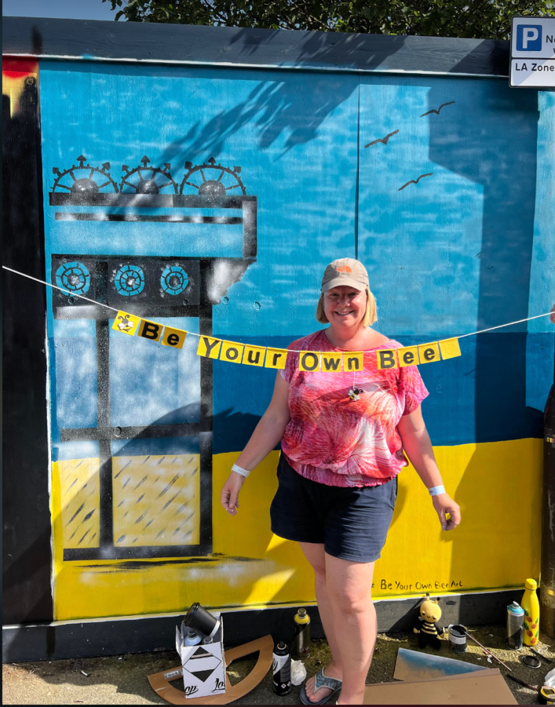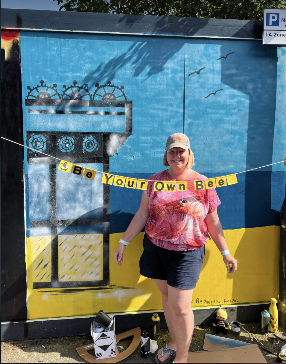A novice at street art, having only painted watercolour 8”x6” usually, Ms Humdrum was supported by a slew of friends and created her piece, based on Southsea’s famous bus shelters, under her art name Be Your Own Bee Art.