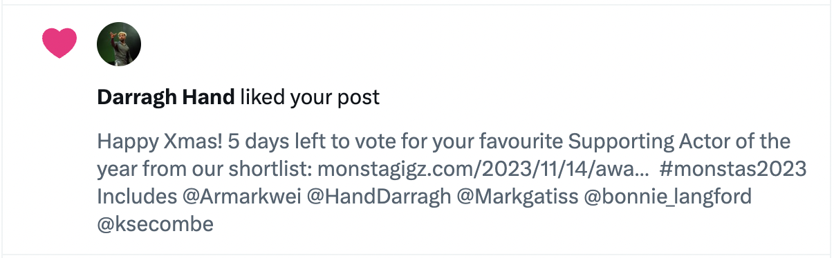 - Vote for best podcast, best venue , best TV/film actress, best TV/film actor, best supporting actor, best TV, best gig, best album, best new play, best new musical, best song, best theatre actor, best film, best performance of a song, best revival and best theatre actress