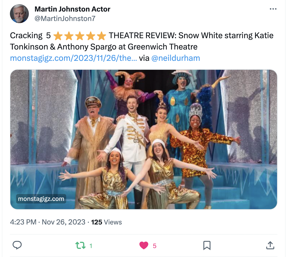 Vanity? Our 1st exposure to theatre was annual visits to pantomimes at Aldershot’s Princes Hall in the 70s and we’ve been visiting them ever since including in Exeter, Portsmouth, London’s West End and, since Red Riding Hood in 2015, at the theatre most local to us, Greenwich Theatre.