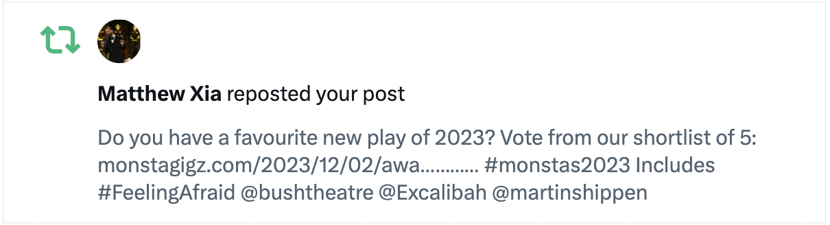 - Read on for the nominees for the monsta for Best New Play of 2023 Previous winners 2022 Tom, Dick and Harry 2021 2.22 A Ghost Story Tickets Review 2020: Death Of England and Death Of England: Delroy, 2019: Appropriate, 2018: The Inheritance, 2017: The Ferryman, 2016: Oddshaped Balls, 2015: Temple