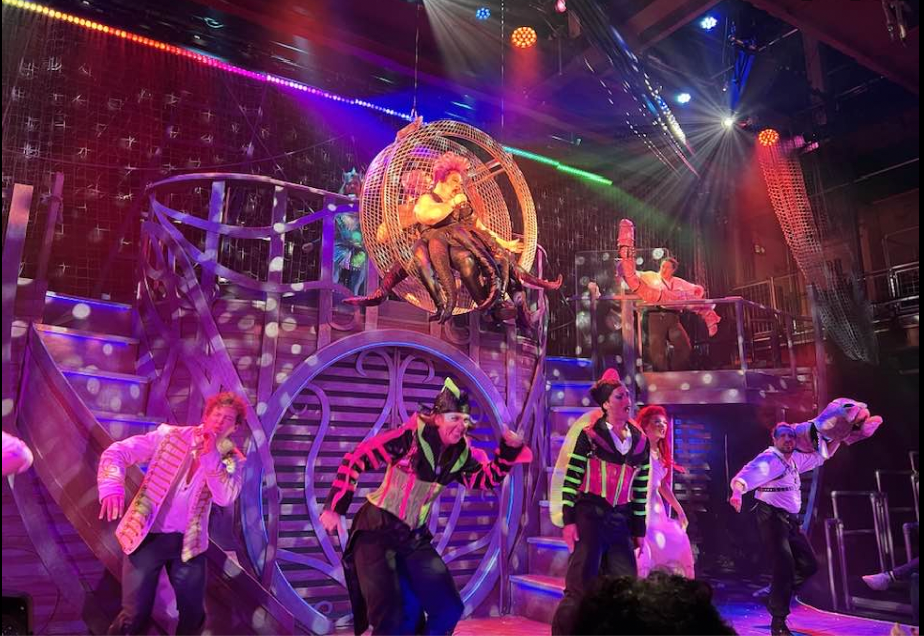 Opened last year Southwark Playhouse (Elephant) is unusual in that it offers an intimate space with a high ceiling suited to the beautiful sunken sea wreck set here and the aerial high-jinks undertaken by many of the cast here to convey the sea in a major glow-up for this parody musical.