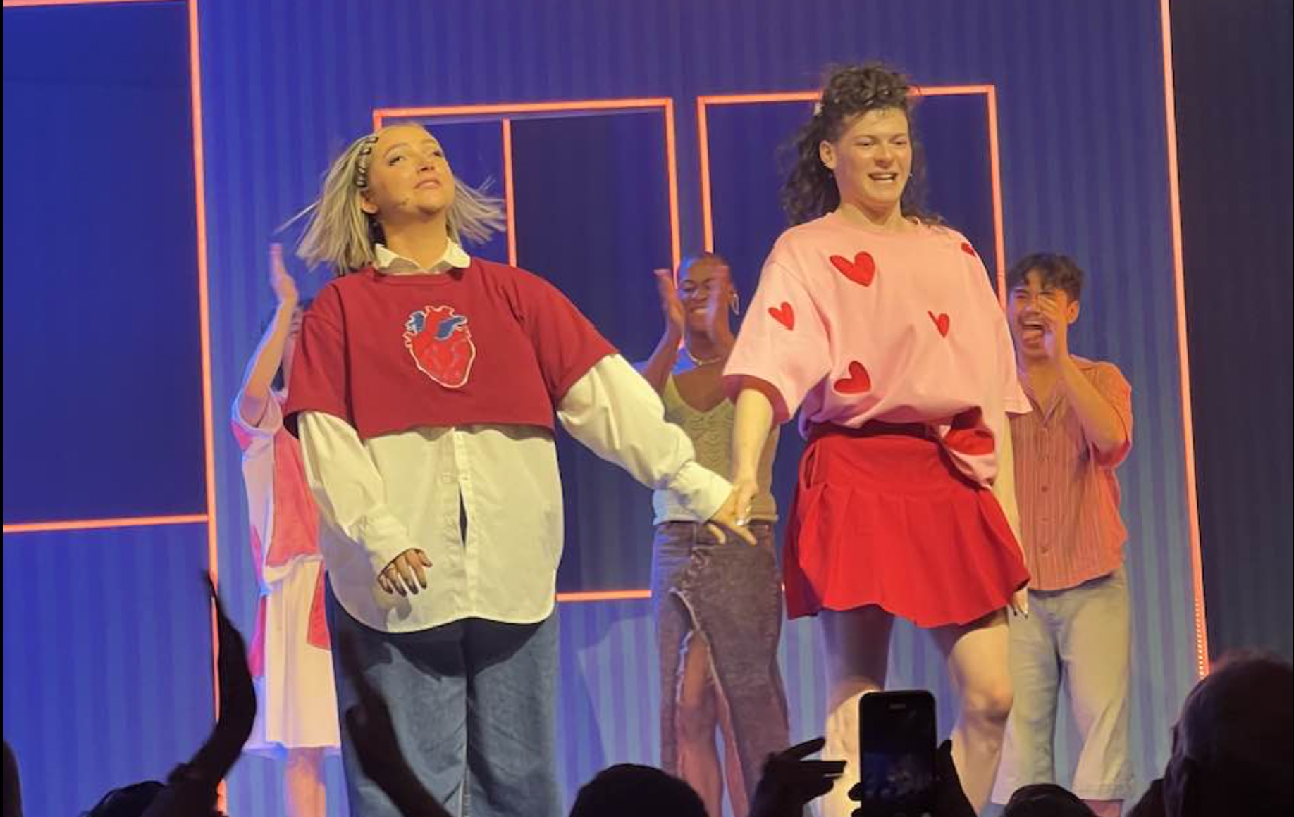 They’re surrounded by a gigantic all-singing, all-dancing cast and during the uptempo Meet Market the transactional nature of dating apps and the trials of social media are exposed while riffing on the shopping trolley video inspiration of Pulp‘s Common People.