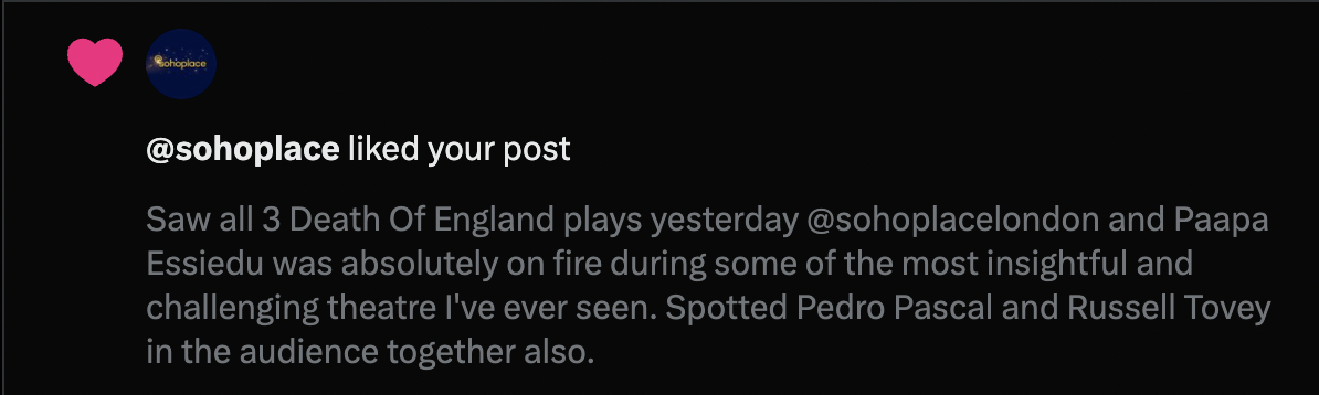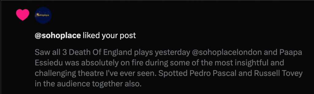 Paapa Essiedu (The Effect, National Theatre) plays Delroy in the 2nd of these intertwined state-of-the-nation dramas and it’s a performance so electric it draws an immediate standing ovation from an audience including Pedro Pascal and Russell Tovey (Constellations, Vaudeville Theatre) who are sitting together near our front row seat.