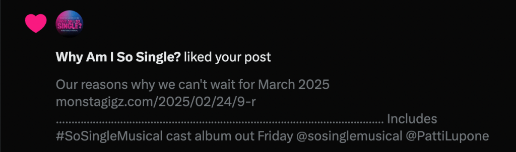 Single? won our Best New Musical and Best Performance Of A Song monstas in 2024 during its 5-month run at London’s Garrick Theatre during which we saw it 4 times. Cast recording is released 14 March 2025 and includes a surprise appearance by musical theatre legend Patti LuPone on track Meet Market. Our review