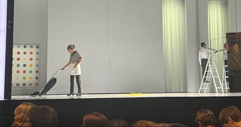 We’d advise visitors to get to the venue early because we bumped into Tyler Ferguson in baseball cap browsing through the programmes in the National’s bookshop 90 minutes before curtain up and when the auditorium does open 2 of the show’s stars are preparing for their guests and establishing the mood (see below) as the crowd takes their seats.