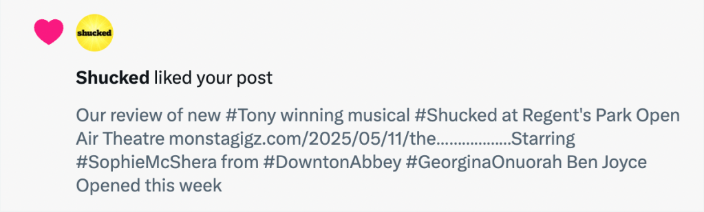 The winner of 1 of the 9 Tonys it was nominated for in 2023, Shucked is a new musical with a book by Robert Horn (Tootsie) and this gorgeous outdoor venue is the perfect setting for a story about nature – its joy and decline – particularly as the sun sets on a beautiful day during the show as it did on this night.