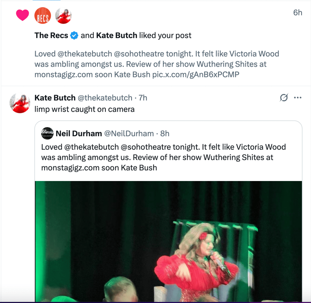 What would Bush think? We had the pleasure of seeing Victoria Wood live several times and the quick-wittedness and daring humour ambling amongst us here very much reminded us of that comedy genius.