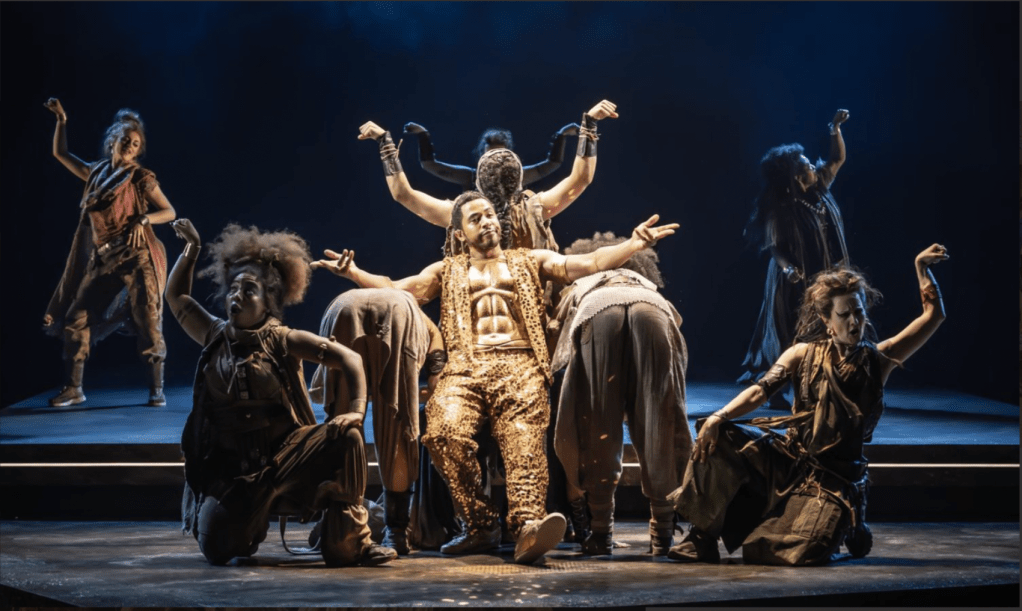 Ukweli Roach’s (Cat On A Hot Tin Roof, Almeida) Dionysus appears to be having more fun chewing the scenery than we’ve ever seen him before in any role as he leads the Bacchae in a plot to oust Pentheus while wearing a blingy gold outfit, gyrating suggestively and singing.