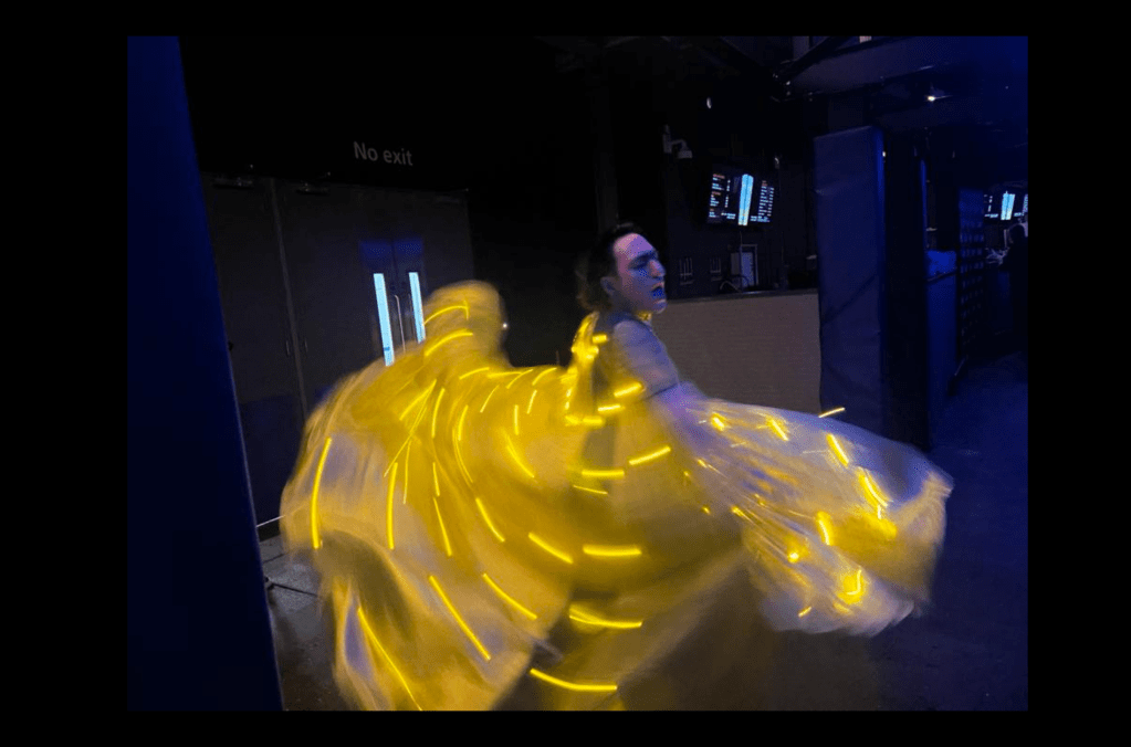 A gay male couple in front of us embrace and a man dressed in a floaty, swirly yellow dress which lights up is spinning to the music, appearing to have the time of his life (see above).