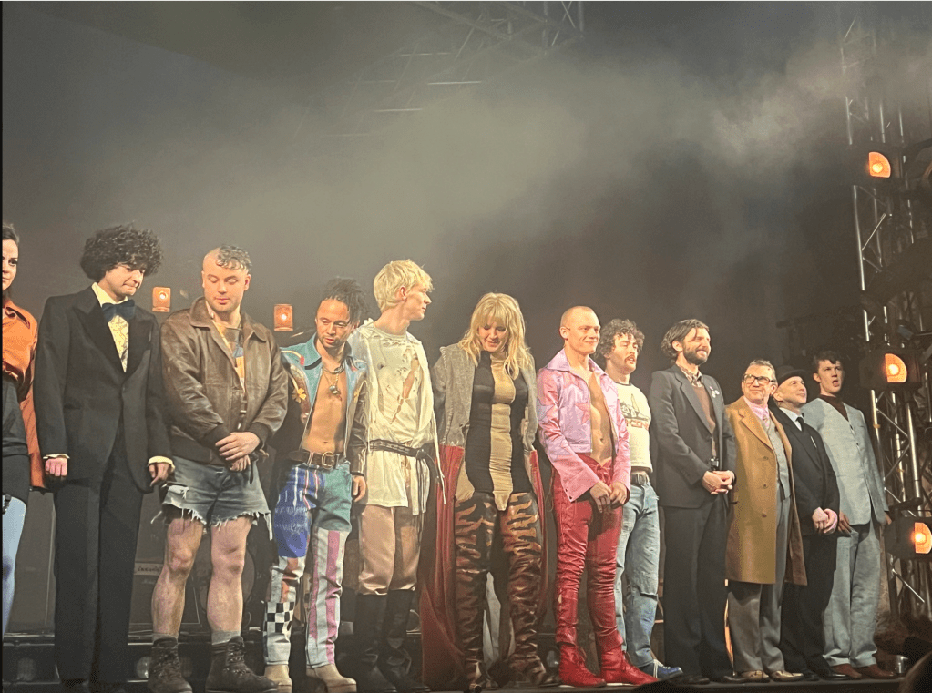 We’re sitting on the end of row 3 in the stalls and there’s great use of the aisles with characters appearing onstage through both of them and the 1st time we see Taylor’s Frisby is as she is carried onstage unconscious by her bandmates and roadie.