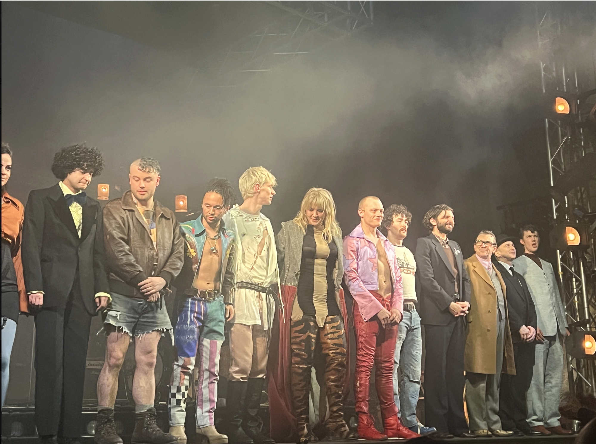 We’re sitting on the end of row 3 in the stalls and there’s great use of the aisles with characters appearing onstage through both of them and the 1st time we see Taylor’s Frisby is as she is carried onstage unconscious by her bandmates and roadie.